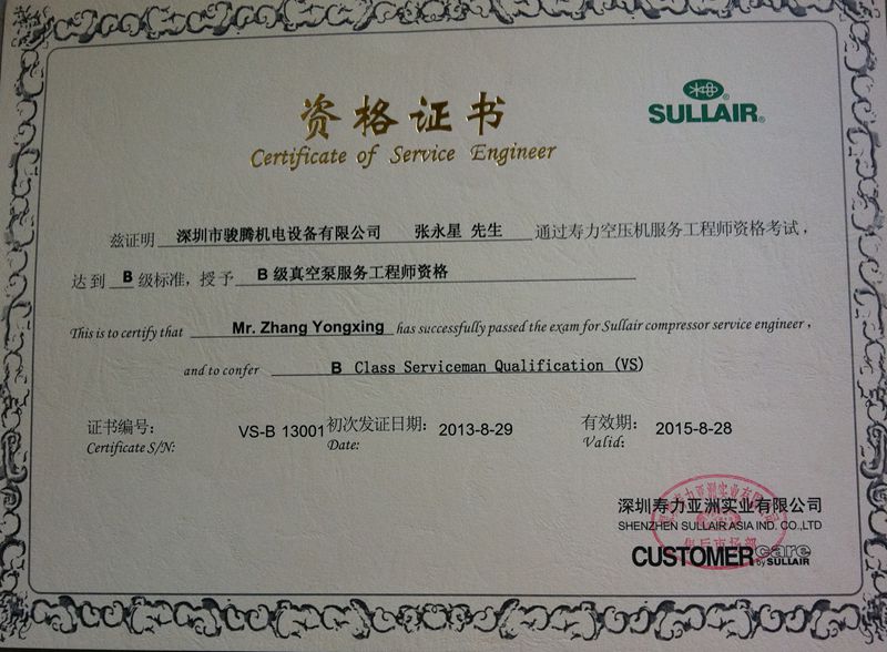 - 張永星獲得B級螺桿式真空泵服務(wù)工程師資格